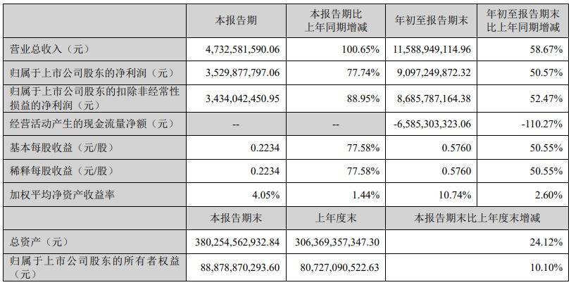 东方财富前三季度营收为115.89亿元,同比增长58.67%;净利润为90.97亿元,同比增长50.57%。其中,第三季度营收为47.33亿元,同比增长100.65%;净利润为35.3亿元,同比增长77.74%。